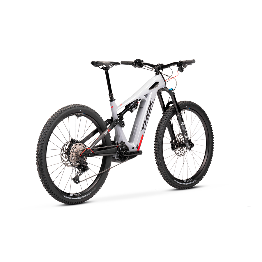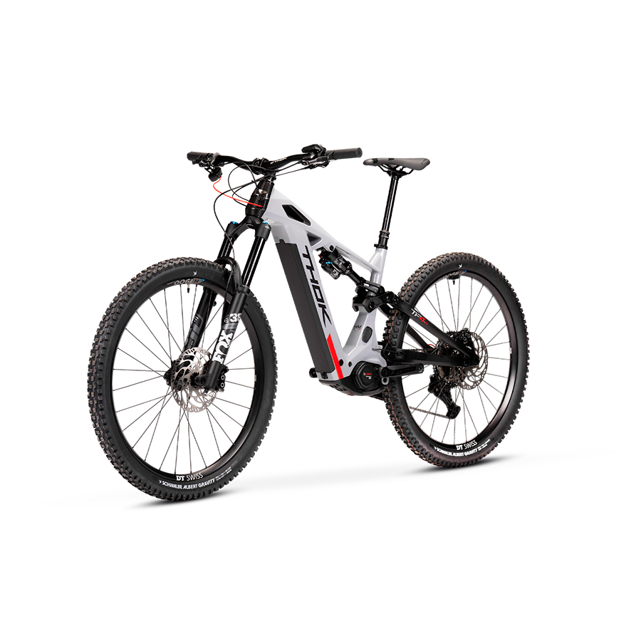 THOK – Carbon fiber (also High Module), headtube tapered 1.5, 29” geometry with flipchip, 27,5” compatibility, integrated down tube battery, UDH Hanger tecnology, enclosed internal cable, fully sealed cartridge bearing, 150 mm travel.